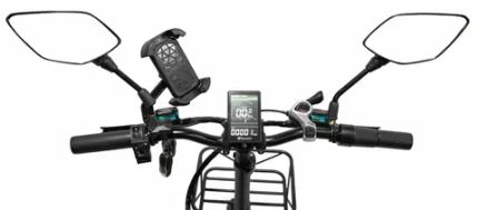 На регулируемом руле расположены необходимые элементы управления: два зеркала заднего вида для контроля ситуации позади, кнопка включения/выключения фары, звуковой сигнал, переключатели режимов скорости и бортовой компьютер. Последний позволяет отслеживать заряд, скорость и пройденное расстояние.